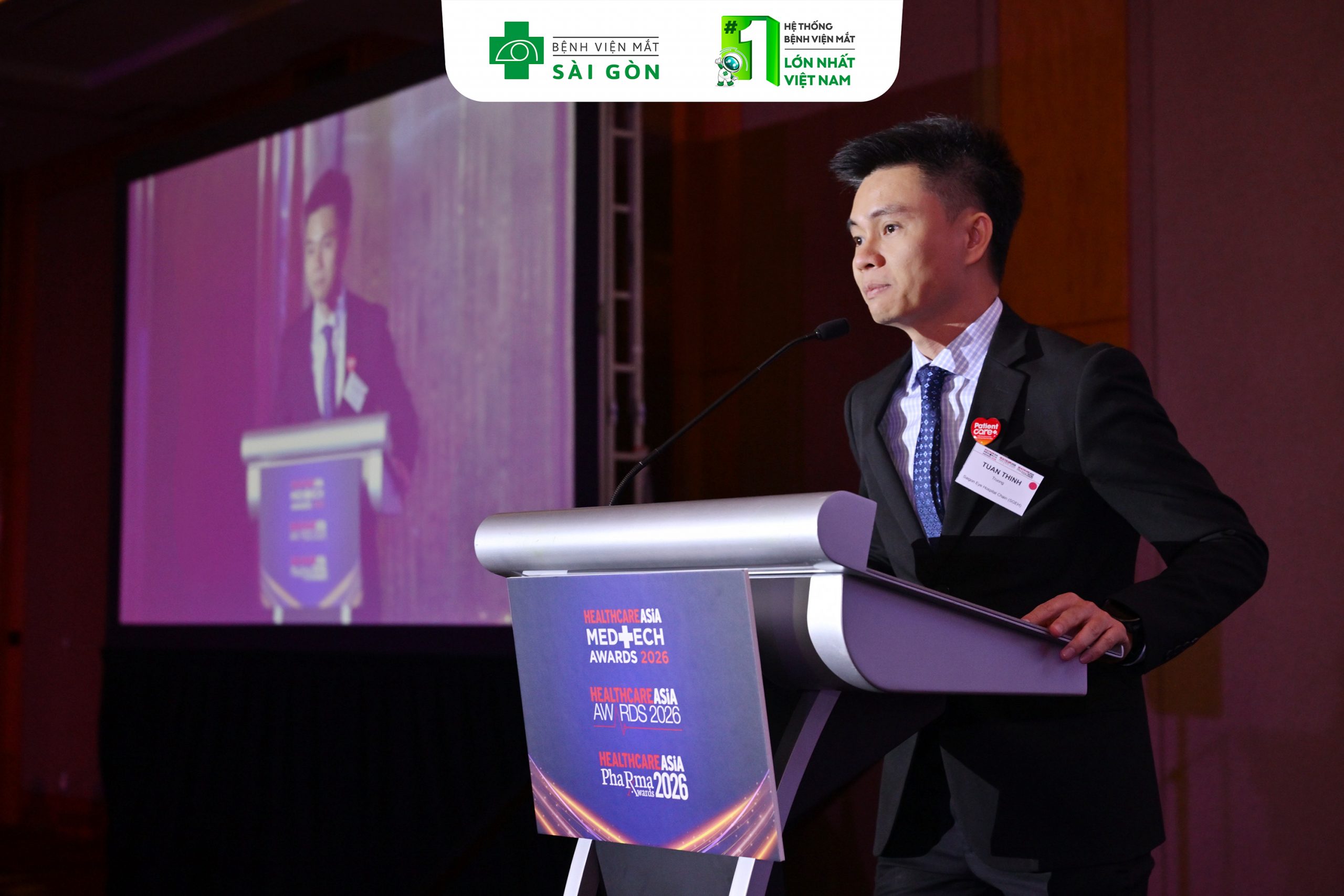 Đại diện hệ thống bệnh viện Mắt Sài Gòn phát biểu tại Healthcare Asia Awards 2026.